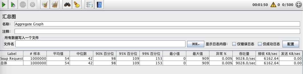 测试参数:设置并行500线程,每线程2000次,共100万次; 每秒处理(1000000/110)=9091次请求